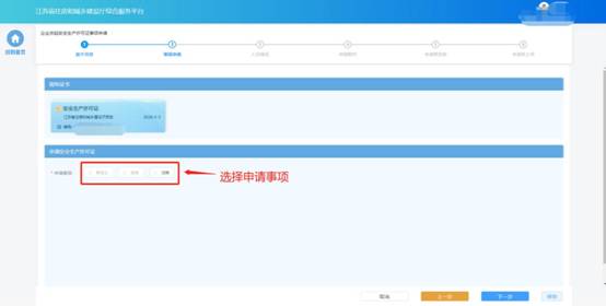 在“申请安全生产许可证”板块选择申请事项,各类事项的选项仅当符