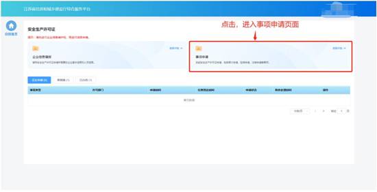 在完成企业信息维护后,点击安全生产许可证功能模块页中“事项申请”进入事项申请页面。
