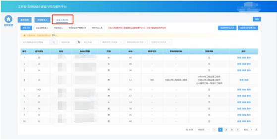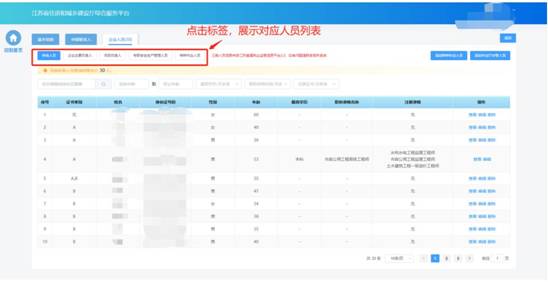 在企业人员页面中维护企业人员信息。其中,三类人员信息来自江苏省建筑业监管信息平台2.0,无需企业手动添加。