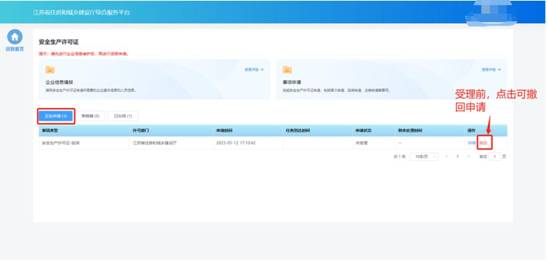 “正在申请”板块中展示企业端已经提交的、目前处于审核流程中的事项申请。在管理端受理前,可点击操作列中“撤回”按钮撤回本次申请,撤回后的申请会进入“草稿箱”。