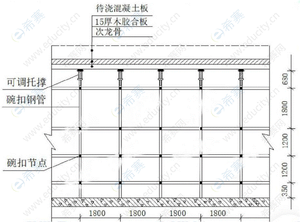 正确做法:可调托撑螺杆伸出顶层水平杆的悬臂长度不应超过650mm;