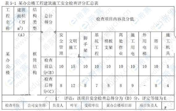 某建筑地下2层,地上18层。框架结构。地下建筑面积0.4万m2,地上建筑面积2.1万m2。某施工单位中标后,由赵佑项目经理组织施工,施工至5层时,公司安全部叶军带队对项目进行了定期安全检查。检查过程依据标准JGJ59的相关内容进行,项目安全总监也全程参加,检测结果如表5-1。