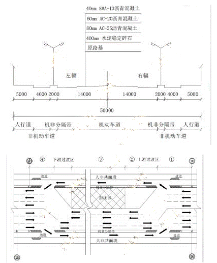 某单位承建城镇主干道大修工程,道路全长2km,红线宽50m,路幅分配情况如图1-1所示,现状路面结构为40mmAC-13细粒式沥青混凝土上面层,60mmAC-20中粒式沥青混凝土中面层,80mmAC-25粗粒式沥青混凝土下面层。工程主要内容为:①对道路破损部位进行翻挖补强。②铣刨40mm|旧沥青混凝土上面层后,加铺40mmSMA-13沥青混凝土上面层。接到任务后,项目部对现状道路进行综合调查,编制了施工组织设计和交通导行方案。并报监理单位及交通管理部门审批,导行方案如图1-2所示,因办理占道、挖掘等相关手续,实际开工如期比计划日期滞后2个月。