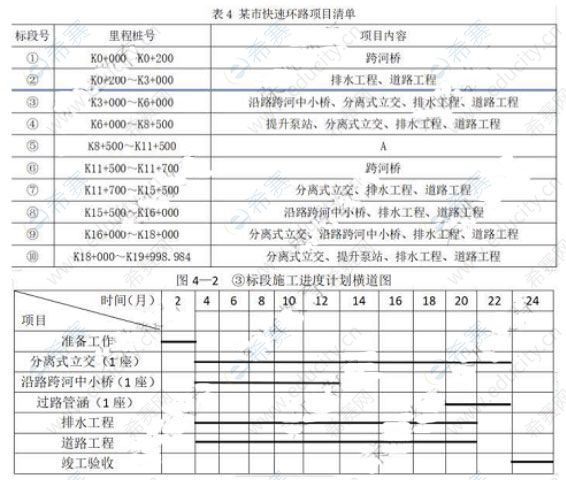 某市为了交通发展需修建一条双向快速环线(如图4 -1所示),里程桩号为K0+000~K19+998.984。建设单位将该建设项目划分为10个标段。项目清单如表4所示,当年10月份进行招标,拟定工期为24个月,同时成立了管理公司,由其代建。