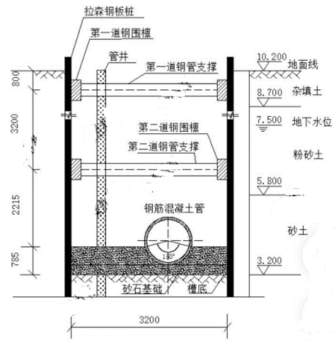 某公司承建一项城市污水管道工程,管道全长1.5km。采用DN1200mm的钢筋混凝土管,管道平均覆土深度约6m。考虑现场地质水文条件,项目部准备采用“拉森钢板桩+钢围檁+钢支撑”的支护方式,沟槽支护情况详见图2。