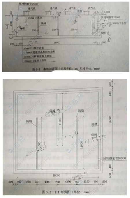 A公司承建某地下水池工程,为现浇钢筋混凝土结构。混凝土设计强度为C35,抗渗等级为P8.水池结构内设有三道钢筋混凝土隔墙,顶板,上设置有通气孔及人孔,水池结构如图5-1、5-2所示。A公司项目部将场区内降水工程分包给B公司。结构施工正值雨期,为满足施工开挖及结构抗浮要求,B公司编制了降排水方案,经项目部技术负责人审批后报送监理单位。水池顶板混凝土采用支架整体现浇,项目部编制了顶板支架支拆施工方案,明确了拆除支架时混凝土强度、拆除安全措施,如设置上下爬梯、洞口防护等。项目部计划在顶板模板拆除后,进行底板防水施工,然后再进行满水试验,被监理工程师制止。项目部编制了水池满水试验方案,方案中对试验流程、试验前准备工作、注水过程、水位观测、质量、安全等内容进行了详细的描述,经审批后进行了满水试验。