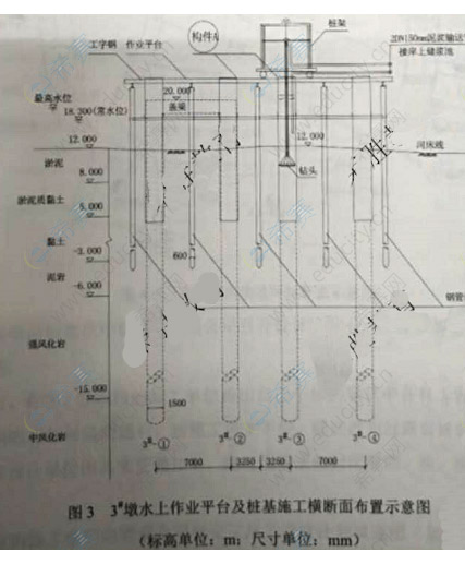 某公司承建一座跨河城市桥梁, 基础均采用φ1500mm钢筋混凝土钻孔灌注桩,设计为端承桩,桩底嵌入中风化岩层,2D (D为桩基直径) ;桩顶采用盖梁连接,盖梁高度为1200mm,顶面标高为20.000m。 河床地基揭示依次为淤泥、淤泥质黏土、黏土、泥岩、强风化岩、中风化岩项目部编制的桩基施工方案明确如下内容: (1)下部结构施工采用水上作业平台施工方案,水上作业平台结构为φ600mm钢管桩+型钢+人字钢板搭设,水上作业平台如图3所示(2) 根据桩基设计类型及桥位、水文、地质笔情况设备选用“2000型”正循环回旋钻孔施工(另配压轮钻头等),成桩方式未定(3) 图中A结构名称和使用的相关规定(4)由于设计对孔底沉渣厚度未做具体要求,灌注水下混凝土前,进行二次清孔,当孔底沉渣厚度满足规范要求后,开始灌注水下混凝土。