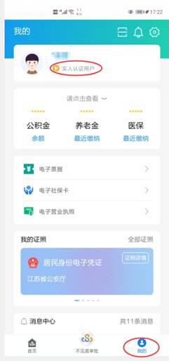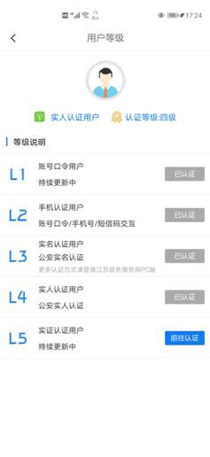2.实名认证。二级注册建造师本人通过手机下载“江苏政务服务”APP,点击“我的”→“立即登录”,通过选择“我要注册”、“支付宝”、“我的南京”等方式进行注册登录,在姓名处下方点击“实人认证用户” →“用户等级”内进行L4级别实名认证。