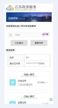 3.事项确认。已完成L4级别实名认证的二级注册建造师本人,应在发起注册申请5日内进入“江苏政务服务”手机APP,点击 “首页”→“江苏政务服务·南京”→“人才服务”→“证书办理”栏内“住建领域从业人员” →进入应用。在“住建领域从业人员”应用内输入验证码→点击“立刻查询”→“待确认事项”里,根据查询结果对申报业务信息“点击确认”,并根据提示点击“同意办件”,进行人脸识别确认(详见附件:二级注册建造师注册申报操作手册)。
