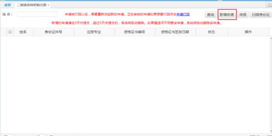 1、企业进入“江苏省建筑业监管信息平台2.0”建造师注册栏目,打开“二级建造师初始注册”页面,点击新增申请,如下图所示: