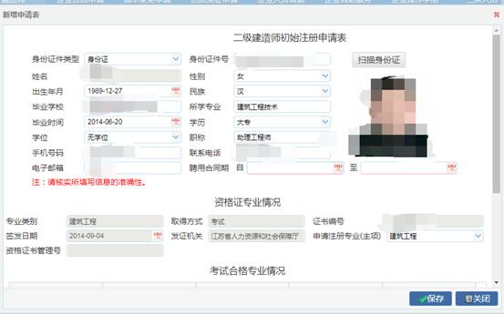 2、录入二级注册建造师身份证号码,自动获取到二级注册建造师信息,填写合同日期等相关信息后,点击保存,并上传附件资料,如下图所示: