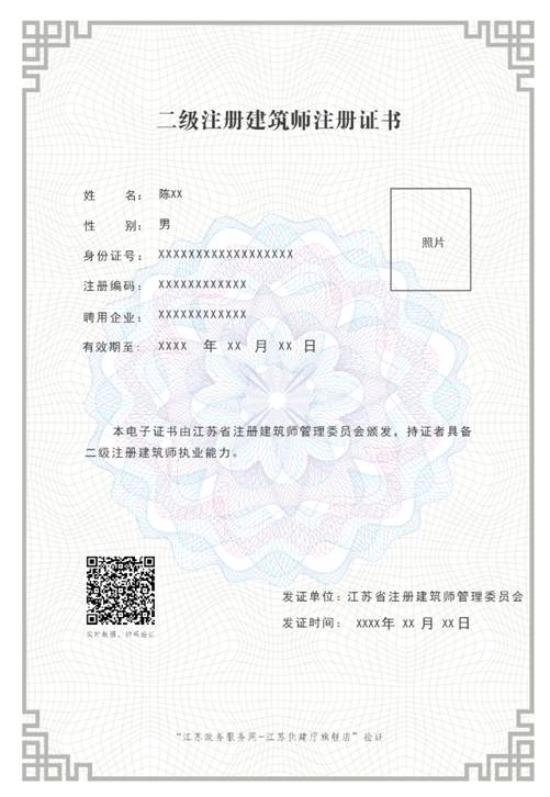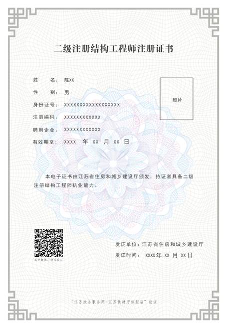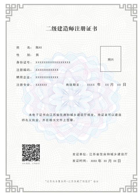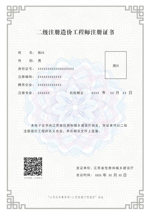 准予注册的,由江苏省住建厅核发《二级建造师注册证书》《二级注册造价工程师注册证书》《二级注册建筑师注册证书》《二级注册结构工程师注册证书》,注册证书以电子证照形式发放(证书样式详见附件2)。