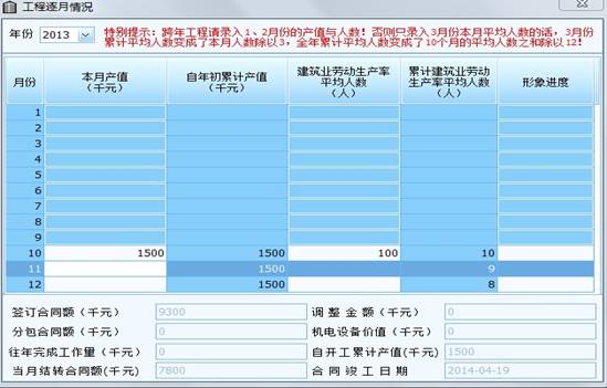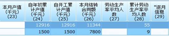 方法是:单击“逐月信息”(29栏)中的小按钮,弹出“逐月信息”子窗口(见上图)后,可录入“本月产值”和“本月平均人数”。如有报告期内新增的工程项目,实际开工日期是本报告期上月或上月前开工的,在“逐月信息”中,其每月完成的产值和每月的平均人数一并记入本报告期月份,开工至本报告期上月空白栏内一律补“0”。