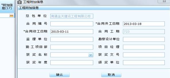 日期格式一律按照国际短日期格式10位数录入(即年为4位,月为两位,日为两位,年、月、日中间加“-”,如2013年6月8日,录入格式是2013-06-08)。单击“附加信息”(17栏)中的“小按钮”,弹出“工程附加信息”小窗口后(见下图),录入相关内容后点“确认”。工程承包形式是总包的,总包单位名称是默认的,工程承包形式是分包的,一定要填总包单位的名称。